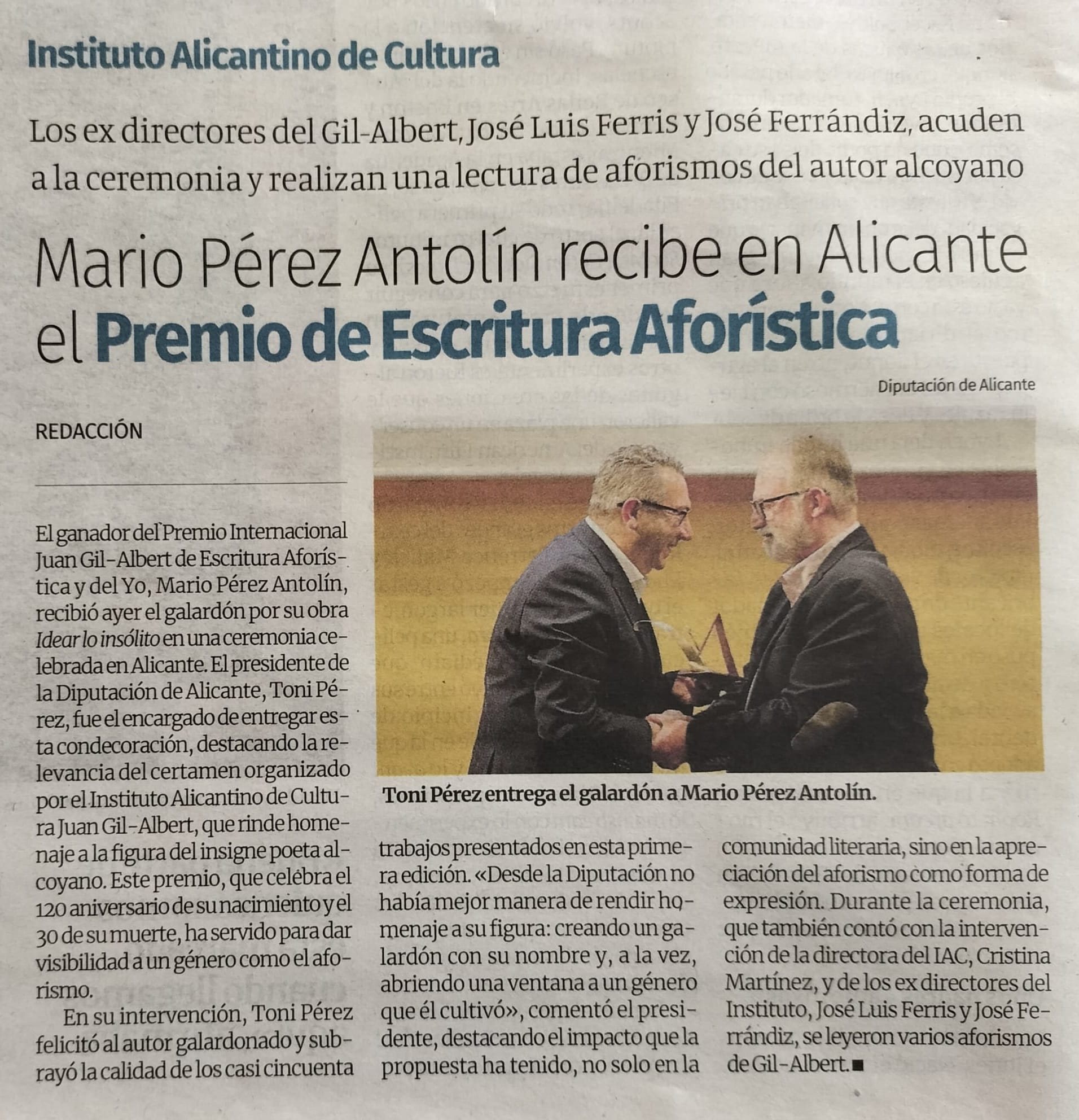Acto de entrega del I Premio Internacional Juan Gil-Albert de Escritura Aforística y del Yo. Periódico Información Alicante. 17 enero 2025